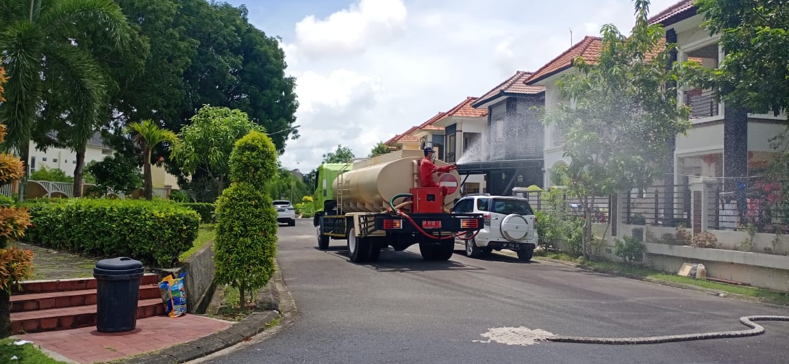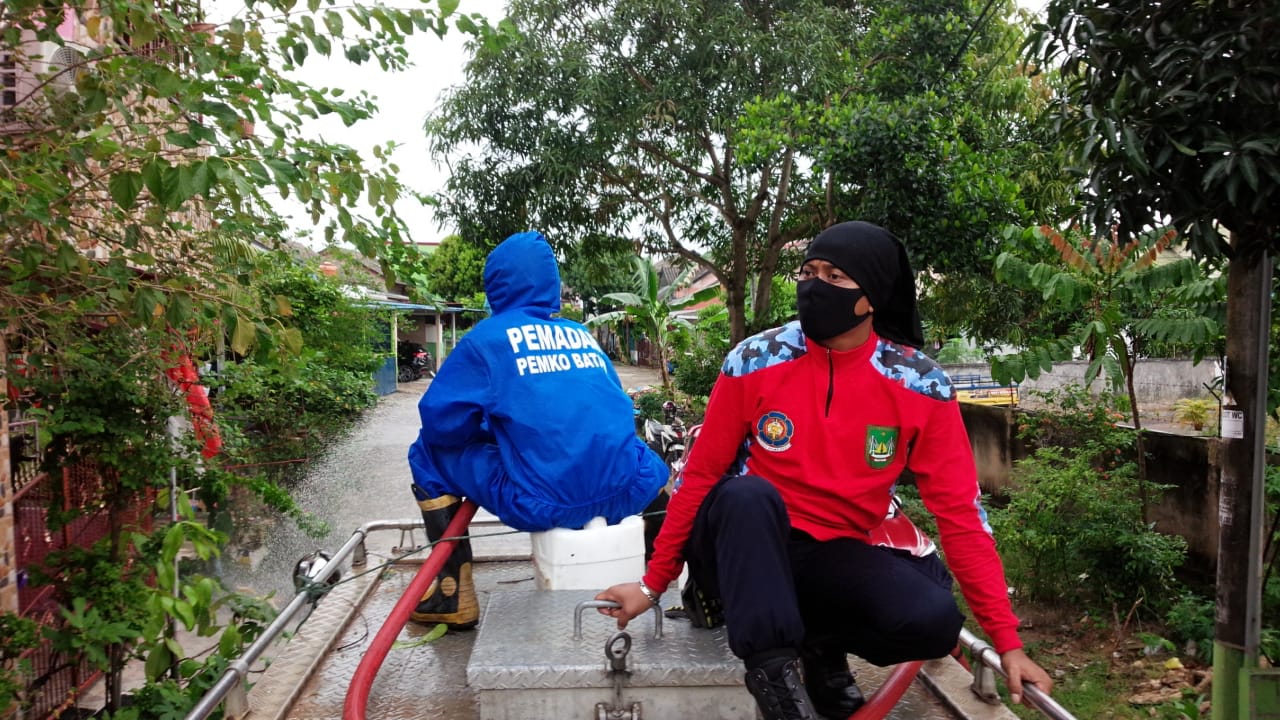 GTPP Covid-19 Oleh Dinas Pemadam Kebakaran Kota Batam melakukan penyemprotan disinfektan di Perumahan KDA Cluster Rajawali dan Cluster Cendrawasih Kelurahan Belian kecamatan Batam Kota.